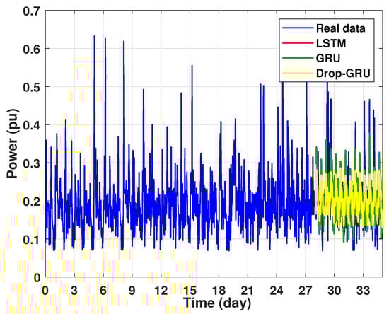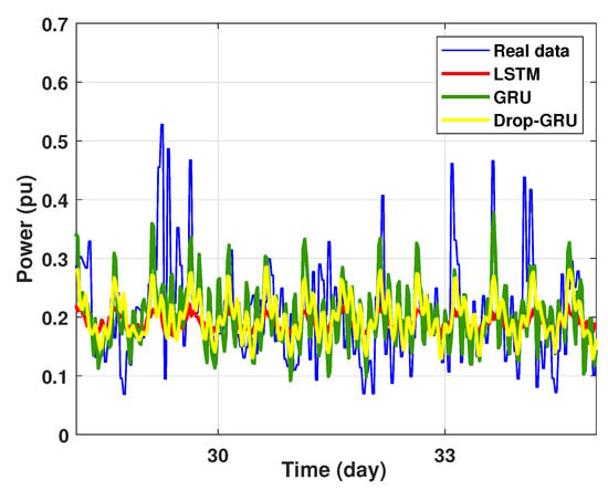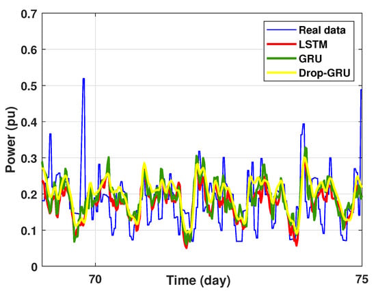 In this experiment, a weekly prediction of the power consumption for the chosen area is presented in Figure 16 and the zoomed versions is illustrated in Figure 17. As shown, the prediction results detect the peaks of the power consumption at the same time as the actual data, but the prediction values of the numerous peaks are lower than the actual values. It can also be noted that the GRU model is the best one in the forecast of high values of power consumption.