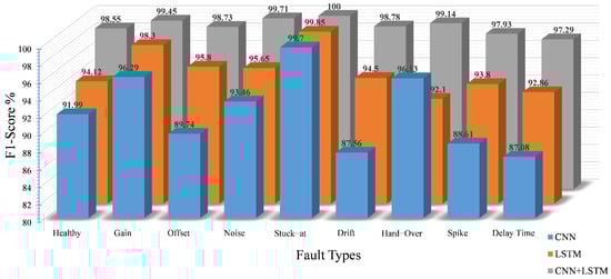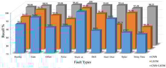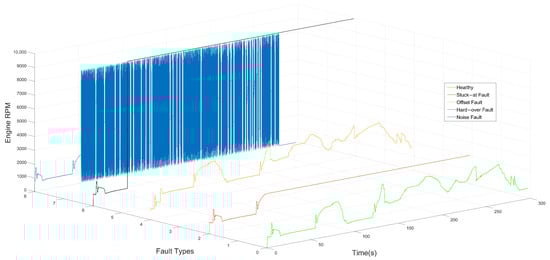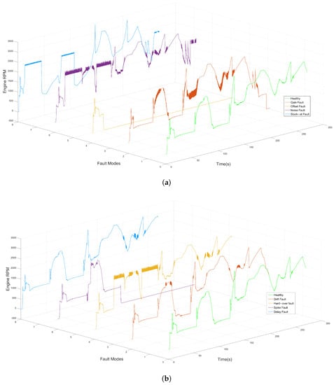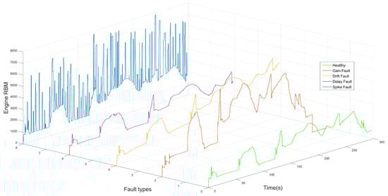The major factor behind the selection of the appropriate classes of fault classification or identification models, based on DL, is the specification of the fault types. Based on recent studies in the literature, faults can be classified into four categories, namely hardware faults [67], software faults [68] and network and communication faults [69]. Each category, in turn, can be divided into subclasses. On the basis of the type of components that contain the defect, i.e., sensors, actuators, a plant or control system, faults are grouped into hardware faults. In contrast, bit fips, runtime errors, processor register corruption and target restart are types of software faults. Communication-related faults involving delays, data loss and out-of-order delivery belong to abnormal states of communication protocols that occur on the network path between components, applications or subsystems. There are also other categories of faults, which can be classified as transient, permanent and incipient, depending on the duration and type of occurrence [70]. In signal-based system behavior, i.e., time-series data, several types of faults have been identified in [71,72,73,74], which take the form of measurement offsets, stuck-at or scaling from true values. Gain, delay, stuck-at, hard-over, spike, noise and drift faults are some examples of sensor and communication faults, as can be illustrated in Figure 2 and Figure 3, respectively.