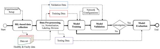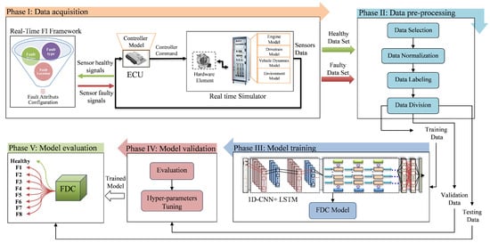 The framework of the proposed FDC method includes five different phases, namely data acquisition, data pre-processing, model training, model validation and model evaluation, which together form the steps to develop the target model, as shown in Figure 4.