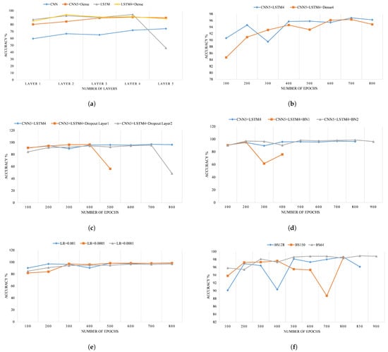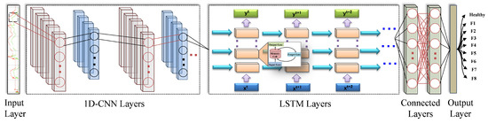 The input layer, 1D-CNN layers, LSTM layers, the fully connected layer and the output layer are the main components of the proposed network architecture. The training data set in the form of time-series data is fed into the 1D-CNN network through the input layer. In particular, after the row data are received by the input layer, local features are extracted by the convolutional layer and stored as feature maps. Feature maps contain different nodes associated with a particular input region. Similarly, several nonlinear activation functions exist to extract features from the input layer. Among them, the most commonly used functions are the Rectified Linear Unit (ReLU), hyperbolic tangent and Sigmoid function. According to the results of the conducted research on the development of intelligent FDD of machines, it has been concluded that the highest test accuracy was achieved with the ReLU activation function compared to Sigmoid and Tanh [97]. Moreover, during the training process, a significant improvement in DNN behavior can be observed when using ReLU compared to Sigmoid [98]. Therefore, after trying the aforementioned activation functions, ReLU was selected for the proposed architecture to obtain a nonlinear expression and provide better discrimination of the learned features.