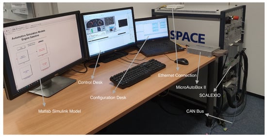 As a case study, the ASM gasoline engine system, combined with the dynamic vehicle model from dSPACE [100], is used to demonstrate the applicability of the proposed methodology and to verify the performance of the proposed model. Additionally, by using the HIL system, healthy and faulty data sets of training, validation and testing are generated in real-time during the operation. Figure 6 illustrates the architecture of the experimental platform used in this work. As can be seen, to achieve high simulation fidelity and to capture the comprehensive characteristics of the system behavior, environmental system models of the case study are included. Specifically, the powertrain, vehicle dynamics and environmental system are modeled and simulated along with the engine system. In addition, in case no real ECU is available, the softECU is employed to enable the simulation of the control logic. Fundamentally, the control system is modeled separately and implemented in the real ECU. To realize the connection between the real ECU and the HIL simulator, I/O blocks are employed to simulate and manage the signals from and to the ECU. The aforementioned systems are modeled and simulated in the MATLAB/Simulink platform. Once the code has been automatically generated from the models, i.e., the plant and the control models, it is deployed and executed on the corresponding hardware system, i.e., the real ECU and dSPACE SCALEXIO. In this study, a real-time system, i.e., the dSPACE MicroAutoBox II, is used as a real ECU and is connected to the dSPACE SCALEXIO via the CAN bus carrying the corresponding sensor and actuator signals, as is illustrated in Figure 7.