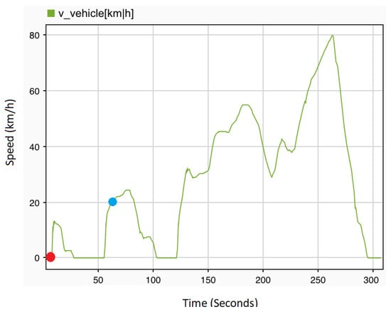 For the setup of the driving scenario, ControlDesk is utilized to select and configure the driving cycle among a list provided by dSPACE, e.g., city and highway scenarios. On top of that, the execution of the selected driving scenario can be enabled in both automatic and manual modes in accordance with the user’s requirements. Figure 8 shows the selected driving scenario in this study. Note that the red dot indicates the starting point, and the blue dot indicates the current location. Figure 9 illustrates the system behavior in the presence of various fault types as a reaction to fault injection.