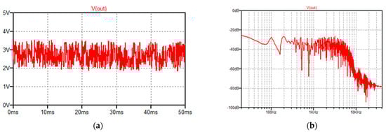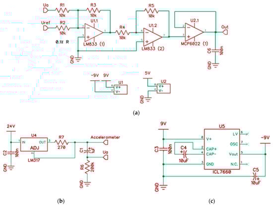 In Figure 1b, the IEPE accelerometer is powered from the voltage source U4. The supply voltage recommended by the manufacturer should be within the range of 18–30 VDC []. In Figure 1c, the U5 unit is presented (ICL7660). It generates a symmetrical ±9 V power supply to the U1 (LM833) operational amplifiers.