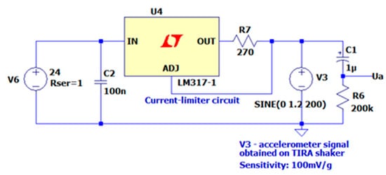 The LM317 stabilizer operates as a constant current source (Figure 2). In this case, according to the application note, the current (I = 1.2/R7) is within the obligatory range of 0.5–8 mA for the accelerometers used. The V3 source reflects the accelerometer output during the tests on a vibration shaker, which was excited by a sinusoidal signal from an external signal generator. The amplitude at the level of 1.2 V at the sensitivity of 100 mV/g means the acceleration of 12 g. The capacitor C1 cuts the DC component. C2 is the required capacity for correct operation of U4.
