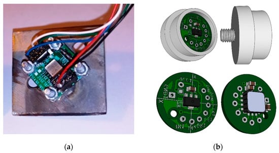 (a) ADXL accelerometer on a metal base; (b) the designed PCB and the case (stainless steel) with M6 screw.