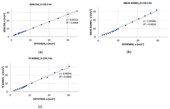 At the same time, the output voltages of the tested sensor and the reference sensor in the range from 0 to 4 g were recorded. The linear regression models were obtained for the vibration frequency of 159.2 Hz (Figure 7a–c). All sensors were supplied with the voltage of 3.3 V from the Tektronix PS2520G power supply. Experiments were conducted at a temperature of 25 °C.
