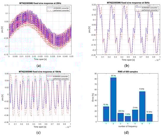 Time response of the tested and commercial AVM4000 converters excited with a function generator: (a) sine 20 Hz; (b) sine 5 kHz; (c) sine 10 kHz; (d) absolute relative difference.