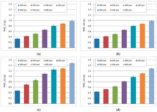 The root-mean square (RMS) amplitude values and error bars (standard deviation), which are graphical representations of the variability of data, are presented in Figure 16a–d. The highest RMS amplitudes were observed for the A1 accelerometer. The bar on the graph represents an averaged value of 1-second or 10-second subsets of the full dataset for a selected sensor.