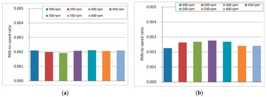 The obtained RMS values were converted into new values, to a small extent dependent on the rotational speed of the machine drive, a relationship termed the RMS-to-speed ratio. These values were almost constant within a range of 300–600 rpm. In Figure 17a,b the significant difference between A1 sensor (shaft bearing) and A2 sensor (main frame) is visible. The relative difference in the ratio is about 25% (on average).