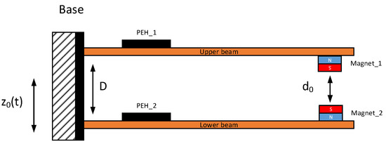 The aforementioned magnetic force, according to the “Vertical Magnetic Method”, is introduced to the system by two cylindrical magnets of the same size located axially in the vicinity of the free ends of both beams. Then, supposing that d0 is the static spacing of the magnets, while is the change of the spacing between the magnets over time, this nonlinear force can be expressed as: