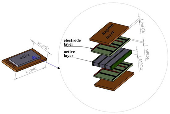 Taking into account [4,47,48], it is known that the macro-fiber composite shown in Figure 2 can be considered as five-layer elements, including a single active layer, two Kapton layers and two electrode layers. As a result, the equivalent values of masses M1 and M2 can be expressed in the following form: