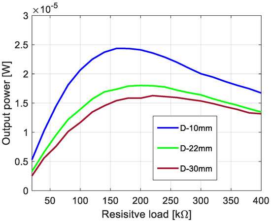 The process of the assessment of the nonlinear system optimization parameters is described in this section. Firstly, taking into account two degrees of freedom of the nonlinear piezoelectric dynamics model given by Equation (2), the eigenvalue problem of this structure has been solved. Then, the calculated first two natural frequencies (6.58 Hz, and 43.35 Hz) on the basis of Equation (2) allows the indication that the best optimal parameters of the energy harvesting system should be obtained for the system working in the low-frequency range up to 15 Hz. Taking into account the value of the first natural frequency, the optimal load resistance for this system has been looked for by assuming that the base acceleration z0 is constant (0.6 m/s2), while the beam space between the upper and lower beams as well as a resistive load RL are different. Considering this strategy, the simulations were performed for three different beams space (10, 22, and 30 mm) and twenty resistive loads in the range of 20–400 kΩ with the interval of 20 kΩ, respectively. The obtained results, included in Figure 3, show that the highest power output of this system is achieved for the structure with the beam space of 10 mm and the piezo-patch connected to the resistive load of RL = 180 kΩ. However, the lowest power was recorded for the beam space D of 30 mm and the energy harvesters connected to the resistive load of RL = 220 kΩ. As a result, it can be concluded that increasing the beam space for coupled magnetic piezo-harvesters leads to a slight decrease in the power output with a simultaneous slight shift in the optimal resistive load.