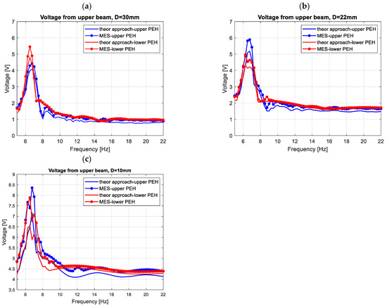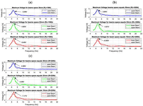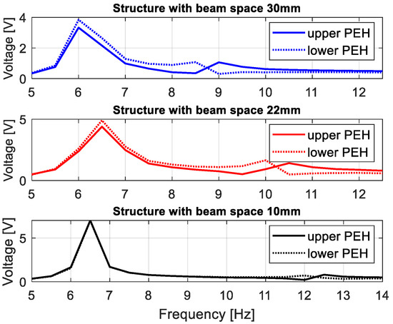 Next, the performance of the energy harvesting system was analysed in the frequency domain for three different quasi-optimal impedance loads. For this purpose, simulations of voltage generated by both piezo-composites were performed by assuming that the excitation signal was a sinusoidal signal with the frequency changing in the range of 5–22 Hz with the interval of 0.25 Hz. The results in Figure 4 indicate that the highest voltage output peaks from both piezo-harvesters were obtained for the frequency of 6.58 Hz, the system with the beam space of 10 mm and the piezo-composite connected to the resistive load of 220 kΩ. Further analysis of the diagrams in Figure 4 showed that the beam space and the impact of the magnetic force with the repulsion effect lead to shifting the frequency range where energy harvesting from vibration is enhanced. As a result, their highest impact is observed for the structure with the beam space of 10 mm in the vicinity of the frequency range of 11–13 Hz, where the voltage from the upper piezo-harvester suddenly increased with a simultaneous decrease in the voltage generated from the bottom piezo-composite. A similar effect is also visible for the structures with the beam spaces of 22 mm and 30 mm, however, in these cases, the aforementioned nonlinearity of the system occurs faster in the frequency ranges of 9–11 Hz and 8–9.5 Hz, respectively. Finally, it can be concluded that decreasing the beam space in the magnetic coupled structure leads to generating higher voltage output at resonance and over it, as well as to changing the frequency where the magnetic forces have the strongest effect on the process.