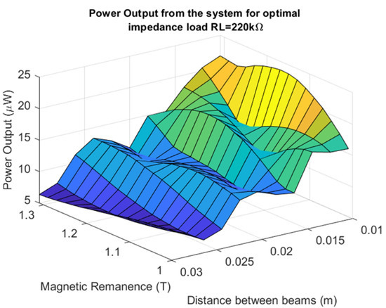 Another parameter that could have an influence on the behavior of the magnetically coupled piezo-harvesters with a homogenized material is the magnetic remanence of the magnets located on the free ends of both beams. In order to check how this parameter affects the efficiency of this system, a simulation was performed again for three various beam spaces, but in this case, for only one impedance load of 220 kΩ. The analysis of the results presented in Figure 5 indicated again a high efficiency of this system for the magnetic remanence of the magnet close to 1.2 T by the lowest beam space. In the case of further increasing the value of the magnetic remanence, it can be noticed that the efficiency of this system has been reduced due to a decreasing voltage output generated from the piezo as well as the impact of the magnetic force on the structure.