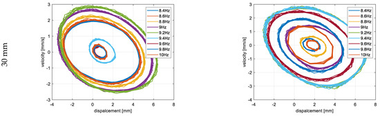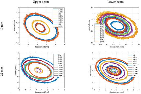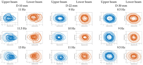 The last step of the experimental test was related to determining the portrait phase of a real structure with considering the repulsion effect of the magnetic force for three different configurations of beam spaces. Taking into account the results presented in Figure 14, the measurements of displacements of both beams in the vertical direction were carried out in three different frequency ranges with an increment of 0.2 Hz. In the case of the structure with the beam space of 10 mm, it was in the frequency range of 11.6–13.2 Hz; for the structure with the beam space of 22 mm, it was in the range of 9–11 Hz; while for the structure with the beam space of 30 mm, it was in the range of 8.4–10 Hz. For each time, both the upper and lower laser displacement sensors were located at a distance of 90 mm from the upper surface of the upper beam and the underside surface of the lower beam, respectively (see Figure 9). In addition, in order to perform precise tests, both measurement points on the lower and upper beams were located at a distance of 20 mm from the free ends of those beams. Observing the diagrams in Figure 14, it can be seen that the magnetic force has the strongest influence on a coupled system with a beam space of 10 mm in a frequency close to 11.8–12 Hz. Then, the trajectories of particular portrait phases of the upper and lower beams are the farthest versus their equilibrium points, as well as they are more chaotic than the other ones. Similar behavior can also be observed for the two other real structures with a beam space of 22 mm and 30 mm. Then, both trajectories of both beams are located, respectively, in the frequency range close to 10.2–10.4 Hz, as well as 9.2 Hz, and are less chaotic in comparison to the previous one. Finally, taking into account all experimental results, it can be concluded that the highest efficiency for the considered structure was achieved for the real structure with the beam space of 10 mm working with the first natural frequency as well as the frequency close to 11.8 Hz.
