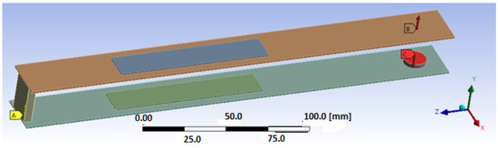 In the next step, the process of discretization of the considered structure is performed using the RVE technique. Then, according to this method, the piezoelectric fiber layer with a homogenized material is modeled using a Solid 226-node coupled brick element, while the electrode and Kapton layers of the harvester are modeled using an 8-node coupled-brick element, Solid186. On the other hand, other passive elements, such as the upper beam, lower beam and magnets are modeled using an 8-node coupled-brick element, Solid186. In the effect, it leads to determining the computational model of the considered structure, which is shown in Figure 7, where the thickness of the adhesive layer (less than 15 µm) is omitted.