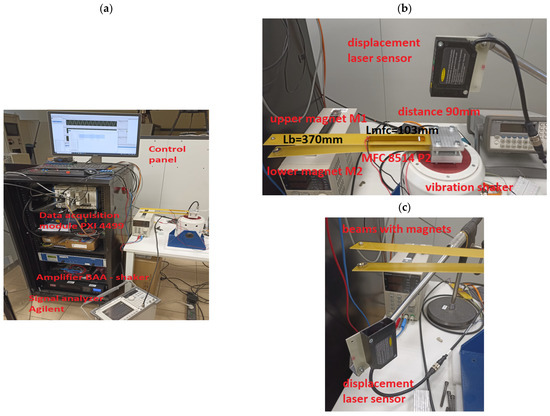 In this section, the performance of the magnetic coupled piezoelectric energy harvesting system, located on two beams, is tested in a laboratory stand (see Figure 9). In order to assess these performances, both glass fiber beams with chosen beam spaces were equipped with a piezo-patch sensor MFC8514 P2, developed by the Smart Materials company, that was located at a distance of 10 mm from the fixed ends of those beams. Apart from this element, both beams were retrofitted into a ring neodymium magnet MP 14 × 8/4 × 3 that is used to introduce the magnetic effect to the system. Regardless of the beam space, this structure is excited to vibration, in the same way, each time, by a harmonic signal generated from the Signal generator developed by Agilent, and then it is applied to the vibration shaker, TIRA S-51110 M. On the other hand, from the measurement point of view, both voltages from piezo-stripe harvesters were measured and recorded by the data acquisition module, PXI 4499, connected to the vibrating structure, while the measurement of the excitation acceleration, as well as displacements of the free ends of those beams, were realized by the laser displacement sensor, LQ10A65PUQ.