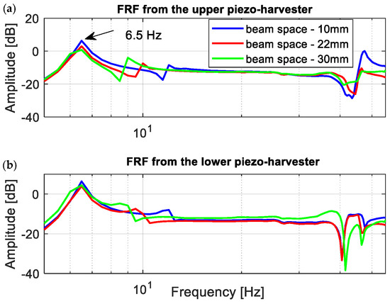 Observing the diagrams in Figure 10, it can be noticed that the generated frequency response functions properly verified the simulation amplitude plots. Especially, it is shown in the vicinity of the first natural frequency, where decreasing the beam space leads to generating the highest amplitude peak of voltage. Further analysis of these amplitude plots also confirmed the fact that the magnetic force acts as the strongest on the structure in a different frequency range versus the beam space. As a result, the repulsed effect of the magnetic force for a real structure with the beam space of 10 mm again leads to the increase of the output voltage from the lower harvester and to a simultaneous decrease in the voltage from the upper harvester in the frequency range of 11–13 Hz, while for a real structure with higher beam spaces, this effect was achieved for the frequencies closer to the first natural frequency.