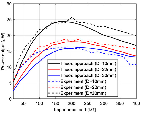In the next step, the process of impedance matching for the magnetic coupled piezo-harvesters located on the top and bottom beams were carried out in a laboratory stand. For this purpose, a series of measurements of the output voltages from both piezo-harvesters were conducted in the time domain at various beam spaces D and various impedance loads RL. Again, as it was described in the previous section, the structure was excited to vibration by using a chirp signal with the same amplitude and the same frequency range (5–55 Hz). The recorded voltages from both piezo-composites firstly allowed to calculate the power output from the system according to Equation (14), and next to indicate the best matching impedance load.
