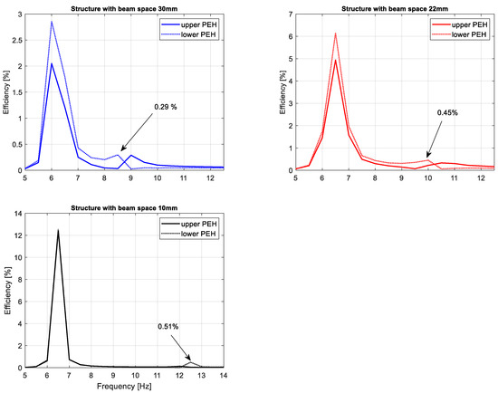 The obtained results presented in Figure 13 indicate that the beam space between magnets in the magnetic coupled harvester structure plays an important role in enhancing the efficiency of this system. Especially, it is shown for a system that works at resonance, where decreasing the beam space leads to four times the increasing efficiency of this system (from 3% up to 12% for the lower beam) as well as for a system that works with frequencies over a frequency resonance where the decreasing of this parameter leads to a temporary increase of this system efficiency up to 0.5%. In the effect, on the basis of the obtained results, it can be concluded that the behavior of the system with the lowest beam space connecting with vibrating structures can be useful to power more amounts of small electrical sensors with low power demand. Moreover, it allows the support of the SHM system, where the fast detection of some changes in the early stage of the mechanical structure performances is required.