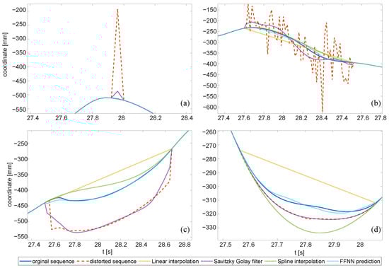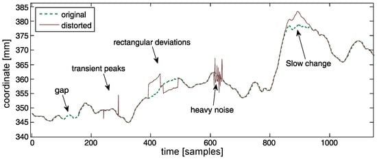 The process of acquiring marker locations is error prone. Distortions occurring in the mocap sequences can be simply divided into two classes—random noise and algorithmically-introduced artifact distortions. Random noise is a consequence of the stochastic processes resulting in different kinds of distortions in a mocap sequence. It has been studied in numerous works [4,5,6,7]. Among the types of noise, the most prominent [8] is white noise, which can be efficiently filtered out [9] or ‘smoothed’. Numerous methods have been proposed [10] utilizing low-pass filtering, interpolating methods, or moving averages.