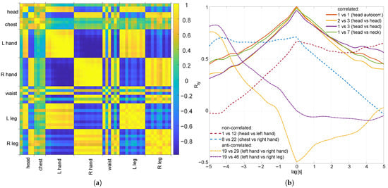 The time aspect of the correlation is depicted in Figure 3b; it presents the correlation and autocorrelation functions for several marker pairs. It clearly illustrates the correlation between successive marker locations and between locations of the markers located in the common body segments and connected body segments (e.g., head and neck).