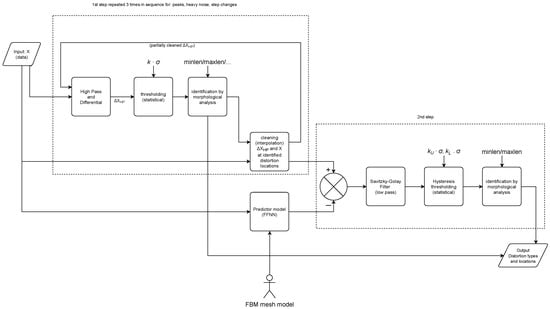 The key idea of the algorithm is to use model (prediction) results as a verification criterion for the data. If the data fall too far from the prediction results, then they are rationally considered distortion, and could be assigned into a distortion class using a pattern recognition method. Each distortion class is identified at a separate stage; it is cleaned from the signal using interpolation. The signal is then passed to the next stage of detection, from the simple distortion (single peaks) to the most difficult (slow changes). The conceptual scheme of the proposed method is depicted in Figure 4; for a detailed view, please refer to the unfolded schematic of the processing pipeline given in Section 3.4.