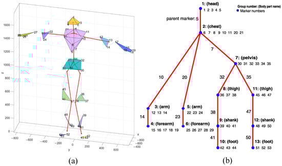 The selection of proper markers to formulate the predictor for each marker according to Equation (3) is based on the body’s hierarchical structure. For that purpose, we used a body structure as depicted in Figure 5a—a functional body mesh (FBM) [12] for an average human subject, inferred for the typical Vicon marker setup. The FBM hierarchy with the corresponding skeleton is shown in Figure 5b. The FBM represents a kinematic structure—group markers located on the structure of the body and a hierarchy as a tree of these groups. The structure-obtaining step must be performed for each class of subjects or different sets of markers separately. The design matrix X was composed of coordinates of parents and siblings in current and k former frames (but it excluded former coordinates of the considered marker). A parent cluster is represented by a single marker—the one that is closest in terms of gradient coherence and distance constancy.