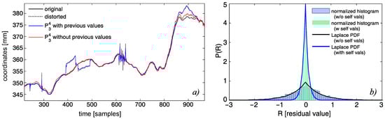 Performance of the two predictor models of (with and without former values of the predicted variables): (a) first dimension of the first marker (with artificial distortions); (b) residual histograms and corresponding Laplace PDFs for (for explanation of the model construction and parameters, see Equation (8)).