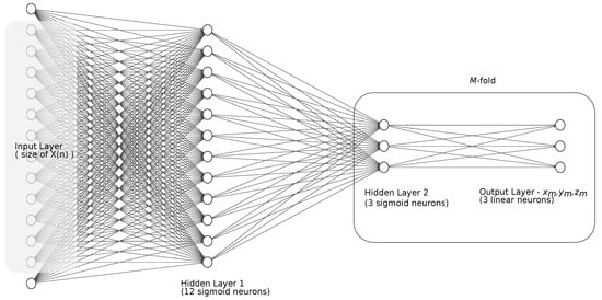 The design of the NN structure is a kind of art, as there are no unambiguous rules or guidelines. Usually, it requires simulating with parameter sweeping for a domain of possible (feasible) numbers of layers and neurons, with a critical review of obtained performance (MSE or classification ratio) [35]. We shared that approach and reviewed the performance of NN using the test data. The NN architecture we employed is presented in Figure 8. It is ordinarily a fully connected FFNN, with two hidden layers—first containing 12 sigmoid neurons, second containing sigmoid neurons. The output is a three-valued vector replicated P times—we used a five-fold replication. As input, we used a similar set of neighbor and parent coordinates to Equation (9); additionally, we enhanced it with the moving average of the own value of the marker. The latter could make the NN follow momentary slow changes; therefore, the window of a moving average () should be notably larger than the lengths of the detected distortions (we assumed it to be 200 samples). By extensive testing, we also identified the number of previous values (=1) and the order of power used to raise the input data (). Finally, each input vector X was long and assembled of certain parts, as given below: