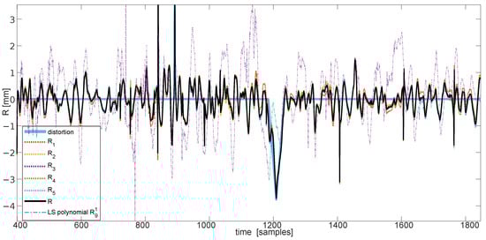 Actual distortion prediction and residuals—component () and final (R), compared with the polynomial residual .