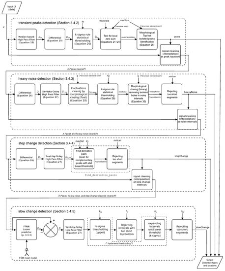 The detection process was organized into a strict pipeline consisting of four stages, where we detected distortions from the simplest to the hardest, along with the removal of the detected distortions (through interpolation after each stage). Such an approach ensures proper classification, otherwise we would have false positive classification due to the fact that subsequent methods could also be sensitive to simpler distortions, i.e., slow change would also be sensitive to rectangular distortion if the amplitude of distortion is sufficient. The detailed schematic of the dataflow in the algorithm is depicted in Figure 10.
