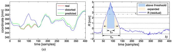 Our demands toward the predictor were slightly specific. One obvious requirement was for it to be as precise as possible. Another (but contradictory) requirement was that it would not follow momentary changes induced by artifacts. Such requirements made us choose a special approach to formulate the X matrix; the predictor efficiency of the predictor depended on the data used. We neglected past values of considered markers—this was due to the fact that the largest correlation was between the current and past locations of a marker; therefore, it ensured the accuracy (Figure 6b). Unfortunately, in case of a distortion, it would make the predictor follow the artifact deviation; see Figure 6a. Next, we chose predictor parameters. Usually, the higher the degree of the polynomial and context size, the higher the precision; however, due to ill conditioning of X, it could reach a higher error with the growing polynomial order. Moreover, too large of an increase would not improve the predictor accuracy. The predictor parameters were tuned with numerical testing with preliminary data. We set up parameters to and , as they appeared during the preliminary model tuning (Figure 7) to be a reasonable trade-off between the predictor accuracy and computation complexity.