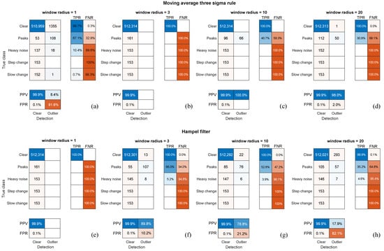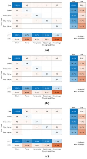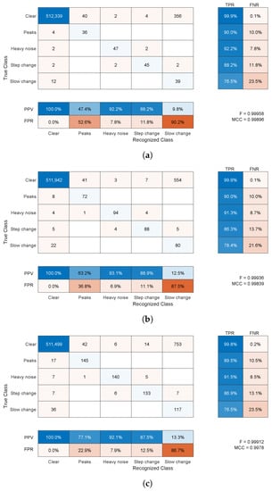 Finally, in the proposal, we presumed that (for certain markers) there was one distortion type at a time. This might not be true in some cases; however, this matters in rare cases, since one fault usually happens at a time, or one is dominant and clutters the others. Some combinations of errors can be well distinguished (e.g., peaks/noise during slow change), whereas others cannot (step changes within noise). Therefore, as we demonstrated in E2, such an algorithm cannot replace experienced operators but can be of assistance, making the jobs faster and less burdensome.