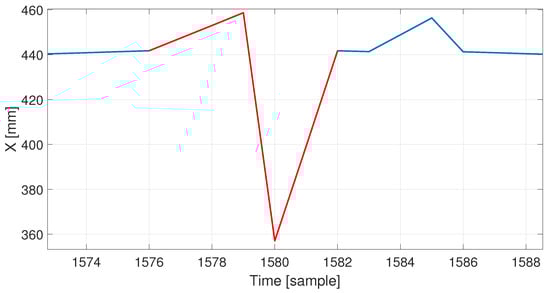 The detection worked using the prediction residuals; therefore, we can see the deviations that cannot be explained by expected movements of markers described with the model. The choices of the models depended on the detected anomaly. For the sudden changes, these models were low-pass filters—median (for peaks) and Savitzky–Golay (for longer distortions); therefore, the respective high-pass filters acted as residuals. For the slow change, the model was FFNN and the residual was given explicitly as the difference between the signal and prediction.