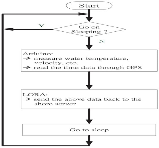 The Arduino platform’s primary function is to control the proposed buoy. Its control work can be divided into two phases: active and sleeping. The Arduino Mega 2560 first instructs the sensors to measure the water quality, such as temperature and velocity, during the active phase. Next, it collects the measurement data and sends them to the shore server using the LoRa wireless communication device. After that, the Arduino will wait for a short time to receive the acknowledgment from the server; this mechanism confirms if the data transmission is successful. After successful communication, the Arduino Mega 2560 now switches the offshore buoy into the sleeping phase for power saving. Later, based on a schedule, it will again wake up the buoy for another data collection round or another active phase cycle. Based on a practical demand, the period considered is 30-min for the proposed buoy system.