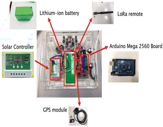 The key hardware components of the proposed buoy system are the control box, solar panel, and sensors. Likewise, an Arduino chip, a LoRa remote module, a solar controller, a Lithium-ion (Li) battery, and a GPS module were integrated in the control box. The details of their functionalities are discussed below.