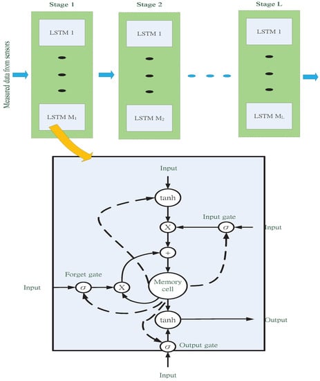 Short-term water temperatures do not change very often and are thus considered a short-term time series with mutual correlation features. Studies have shown that long short-term memory (LSTM) [41], a machine learning model, is suitable for time-series-related problems. It uses the mechanisms of the hidden layers to retrieve information from the correlations between time series. Figure 5 shows the multilayer structure and the widely used cell structure for LSTM. LSTM is a variant form of gated recurrent neural network (RNN), and proposed by Hochreiter and Schmidhuber in 1997 [42]. In addition, LSTM can overcome the problem of gradient disappearance or explosion, which usually appears at the conventional RNN while using an excessive number of layers in the time dimension. In particular, due to the gated control architecture, LSTM can suitably tune the self-loop weights and dynamically regulate the accumulated time scale. Among the gates of the LSTM, the input gate determines whether the inputs can be imported into the memory cell. Further, the memory cell can be linearly self-looping, whose weight is controlled by the forgetting gate. As for the output, its on–off is determined by the output gate. The gate units as mentioned earlier are the sigmoid functions, denoted as . The overall computation of an LSTM cell can be expressed as follows,