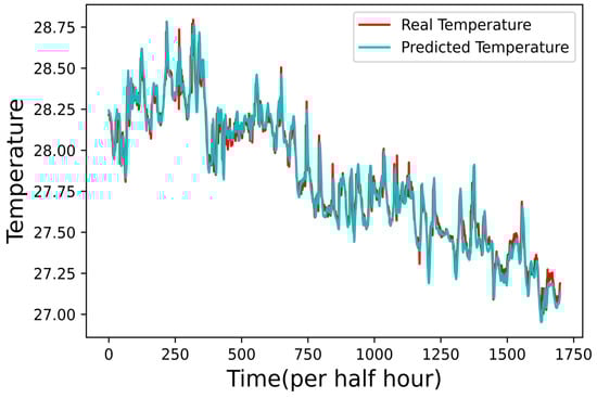 To predict water temperature, we designed an AI program to construct an LSTM-based network. We incorporated one of the hidden layers with 16 neurons in this network. Furthermore, we adopted the LSTM package of TensorFlow and the adaptive moment estimation (Adam) optimizer for the network. Further, the network is trained using 100 epochs and a dataset size of 734,000 water temperature data stored at the shore server. On the other hand, we use the other 314,573 water temperature data for testing the network. Given the space limitation of the figures, only 1700 tested results were shown in Figure 6, including the actual water temperatures and the prediction results of the network. For the mean-squared error (MSE), the result shows an in-between value of 0.021 °C. Most fish species are not sensitive to slight changes in water temperature, therefore, based on the results of Figure 6, the water temperature AI prediction program is a suitable method to implement the practical requirements in an offshore aquaculture environment.