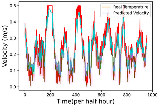 Another AI function was constructed using an LSTM-based AI network to predict water velocity. Instead of a single hidden layer, two hidden layers were integrated for this other set of LSTM network since changes in the water velocity are relatively faster than that of water temperature. Furthermore, the number of neurons for the first and second layers are 96 and 64, respectively. We trained the new network using 100 epochs with a dataset of 36,237 water velocity data taken from the shore server. The other 15,531 water velocity data are used to test the network, and the prediction results are presented in Figure 7. Since the space for the figures is limited, only 900 results were captured in Figure 7. The result for MSE using the actual and the prediction value is 0.92 cm/s, which again implies that the AI program for water velocity prediction is suitable for offshore aquaculture.