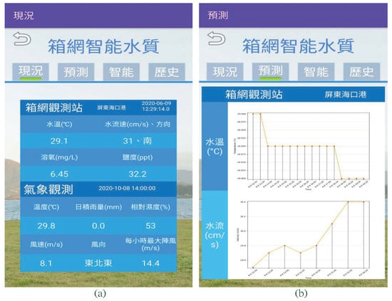 In Figure 9a, we presented the system’s capacity to directly provide real-time water quality information from the offshore cage location. Furthermore, to offer comprehensive content, we integrated a web crawler in the APP to fetch local weather data from Taiwan Central Weather Bureau to provide additional valuable information to the aquaculture staff. With the integration of AI functions (discussed in Section 4), the short-term prediction information for water temperature and velocity are plotted at the top and bottom parts of Figure 9b.