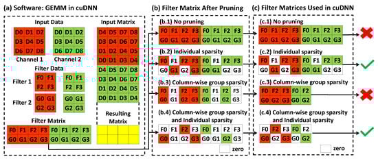 Observations of different strategies’ pruned filter matrix for hardware acceleration with software implementation of convolution in cuDNN. (a) General Matrix Multiply (GEMM) is applied in cuDNN. (b) Different strategies such as no pruning, individual sparsity, column-wise group sparsity, and both individual sparsity and column-wise group sparsity on pruning the filter matrix. (c) The pruned filter matrix implemented in cuDNN and determined whether it can be used for hardware acceleration or not.