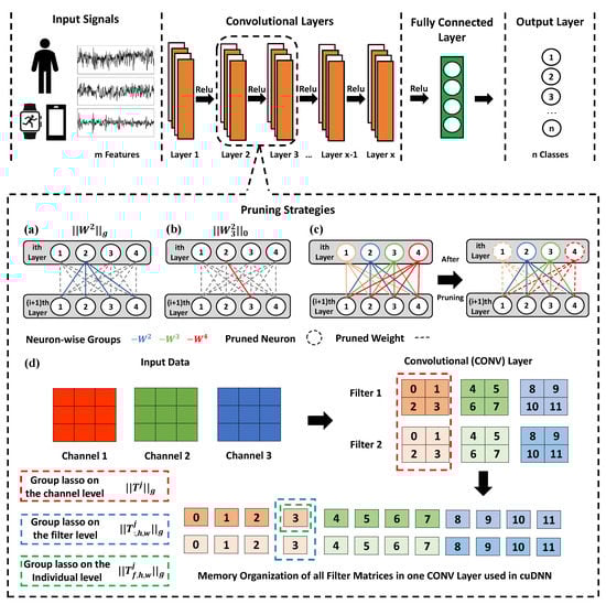 The central idea of MobilePrune is to compress the deep learning model in a way that is compatible with the architecture of data organization in the memory by combining regularization and group lasso regularization. The group lasso regularization helps to keep important groups of weights that benefit cuDNN, while regularization helps to achieve additional sparsity within those important groups that are needed for hardware acceleration. Figure 2 provides an overview of the proposed MobilePrune method. As illustrated in Figure 2a–c, the group lasso penalty will remove all the weights together with the ith neuron if it is less important for the prediction and if a group is selected, the penalty further removes the weights with small magnitudes within the group. Note that zeroing out the weights connected to the ith neuron results in removing the ith neuron and all the associated weights entirely. We will discuss more detail information in next section.