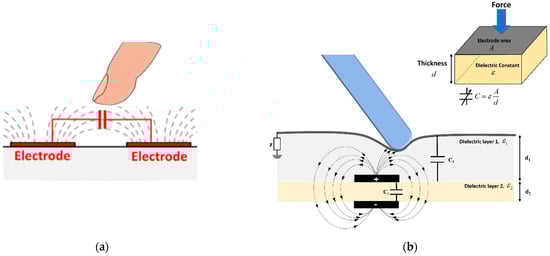 Schematic view of the working principles for the (a) typical capacitive sensor and (b) proposed sensor.
