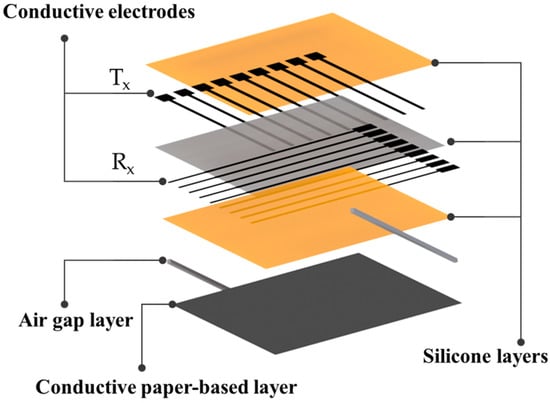 Capacitive sensors mainly consist of two conductive layers separated by a dielectric elastomer layer. The capacitance changes when the object moves nearer to the electrodes (Figure 2a). This also changes the local electric field. In the most recent approaches, the object should be conductive or semiconductive with significant impedance for observable changes in the electric field. However, some approaches depend on the sensitivity material of electrodes, such as an elastic carbon nanotube (CNT). In this case, the capacitance is also altered by non-conductive materials []. Our work aims to develop a new type of capacitance sensor that can measure contact points by applying pressure with any object without requiring conductive materials. The schematic view of the working principle of the proposed sensor is presented in Figure 2b. The contact point can be detected by changing the capacitance of the touching point area. It consists of two orthogonal arrays of electrodes: vertical lines (Tx) for sending, and horizontal lines (Rx) for receiving. A small voltage is applied to Tx to build an electrical field between the electrodes. The displacement current resulting from changing the electric field is measured at Rx. A conductive flexible substrate with a ground connection is designed at the top of the layers, as described in Figure 3. Bringing the object closer to the surface drains a certain amount of field lines between Tx and Rx, which can be observed to specify the touchpoints. Furthermore, the other complementary effect of this design type is pressure sensitivity. By applying an external force, the electrode distance changes, as shown in Figure 2b. The amount of force can be measured from the produced current displacement. The capacitance for a parallel plate can be described as calculated by Equation (1),