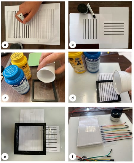 Figure 4 presents the fabrication procedures of our flexible capacitive sensor. The sensor architecture was developed with a top layer of silicone, two conductive layers for horizontal and vertical tracks, two layers of silicone elastomer, and a conductive shield as a bottom layer. It should be fabricated layer by layer. Due to its prominent features, including lightweight, hyper elasticity, and fast and easy fabrication, silicone is one of the most widespread materials used in soft robotic systems. Ecoflex is one of the popular silicones frequently used. It is commercialized by Smooth-On []. Considering the application, the shore hardness range of silicone can be selected from 00-10 to 00-50. In this article, the silicone Ecoflex 00-50 was used to fabricate the sensor layers. The elastomer material properties are summarized in Table 1. These properties allow Ecoflex to expand from its primary dimension many times without tearing, making it a proper choice for soft sensor applications. For more information about other types of silicone used in soft robot applications and their mechanical properties, the reader is referred to the review article []. The conventional molding technique was used to fabricate different layers of the proposed sensor. A 3D printer was used to make the layer frames with different thicknesses to find the optimal thickness of the layers related to the sensor’s sensitivity. Ecoflex consists of two parts that should be mixed well with the same ratio, according to the manufacturer’s instructions. After mixing the two silicone parts and before pouring them into the mold, vacuum degassing was applied for around three minutes to remove air bubbles. Ecoflex layers were cured after three hours at room temperature. The curing time can be less than an hour by utilizing an oven to heat the mixing liquid up to a temperature of around 70°. Table 2 compares the materials cost of the proposed sensor with the most used materials to fabricate tactile/capacitance sensors. As shown in this table, the total price of our proposed sensor is noticeably lower than the other methods.