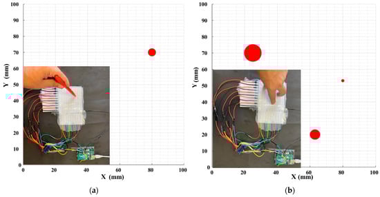 Multi-touch force/tactile capacitive 100 × 100 mm soft rectangular pad: (a) non-conductive object (plastique pen) and (b) conductive object (human finger) with different pressures applied.