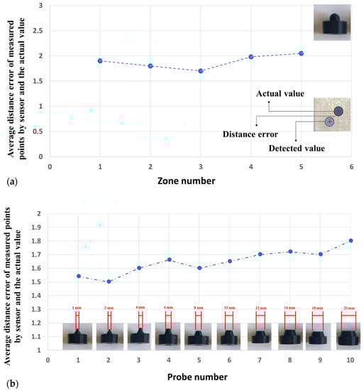 The average distance error of measured point by the sensor and actual value: (a) Each probe is touching Zone 1 to Zone 5, repeating 10 times to record the sensor measuring point, and (b) different probes are utilized to touch the center of the sensor 10 times.