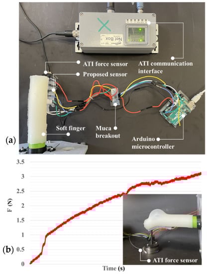 (a) Calibration setup assembly and (b) testbench for measuring the finger’s force.