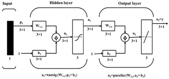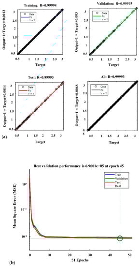 where m represents the number of neurons in the hidden layer and n is the number of input neurons. Considering that there is one input, the number of hidden layer neurons is 3. To compare the optimization algorithms, first, it is necessary to design an ANN, and then evaluate the performance of the ANN in predicting the objective function value. Indeed, it is essential to measure how well the ANN adapts to the training data. It is observed that if the ANN generalizes well, it has captured the system characteristics. Some different performance measures are used through the training process to evaluate ANN architectures. In this study, the mean square error (MSE) and determination coefficient (R2) are considered as the performance function. The mean square error (Equation (6)) is used to determine how well the ANN output fits the desired output presented in the training data. Therefore, the determination coefficient (Equation (7)) is related to the difference between the network output and the desired output [].